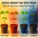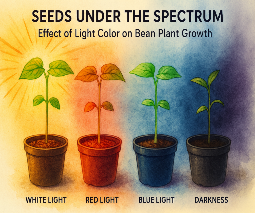 Bean seeds were planted in identical pots and grown under controlled environmental conditions. Each group of plants was exposed to a different light treatment: white, red, blue, or darkness as a control. Plant height was measured regularly, and additional observations were recorded regarding leaf color, stem thickness, and overall plant appearance.