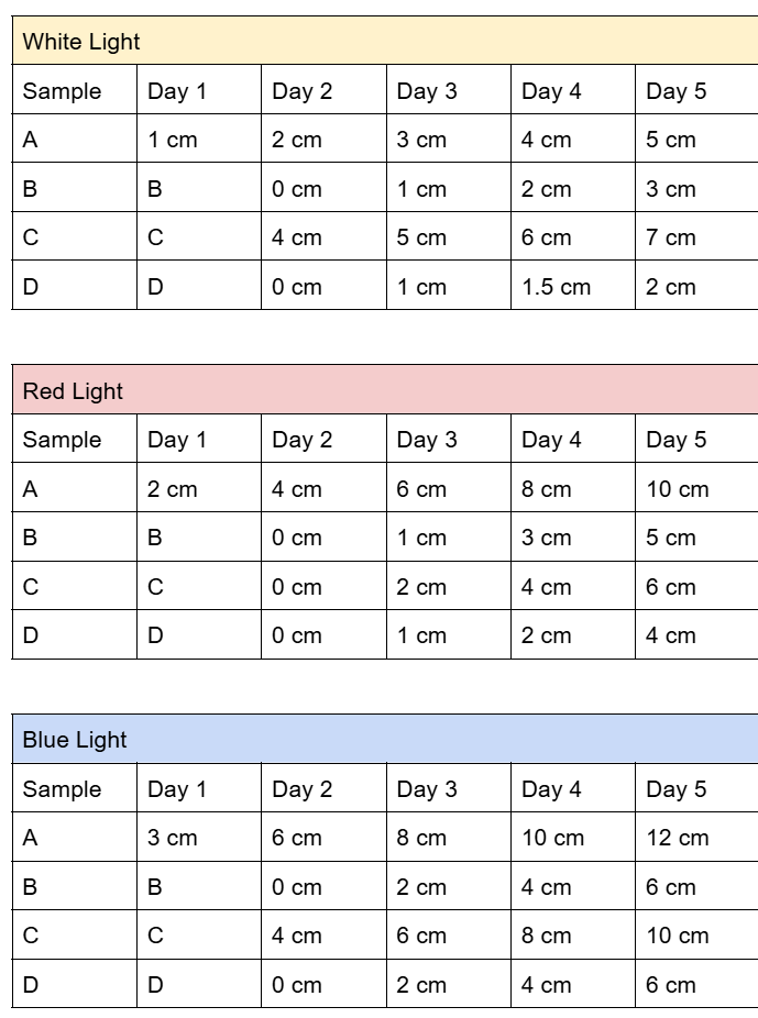 Por ejemplo, algunas muestras bajo luz azul alcanzaron alturas de hasta 12 cm en cinco días, mientras que las plantas bajo luz roja y blanca presentaron incrementos menores en el mismo periodo.