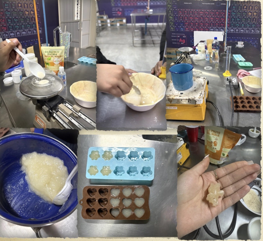 Gummies are a popular product in the confectionery industry, characterized by their variety of flavors and attractive shapes. They are soft or chewy candies made with one or more gelling agents, which have the property of absorbing and swelling upon contact with a liquid. When the liquid is heated, a colloidal system is formed. As the fluid cools, its viscosity increases, and it solidifies into a gel. This solid-looking gel is formed by the creation of a three-dimensional structure that traps and retains the liquid, maintaining the shape of the mold in which the gelation occurs. While this type of candy is widely consumed, some manufacturers produce them with excessive amounts of sugar and colorings that are harmful to health. Therefore, this project aims to develop an innovative gummy candy with improved nutritional value and sensory quality, as well as increased protein and fiber content, while reducing carbohydrates and sugars.