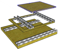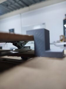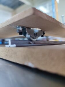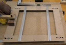 Sobre la base, se instalaron rieles metálicos de aluminio. La primera plataforma (eje X) es de madera de baja densidad de 38 cm x 38 cm la cual se desplaza sobre la base fija. Dicha plataforma cuenta con 4 patines de aluminio alineados con los rieles en la base. A su vez, se instalaron rieles de aluminio sobre la primera plataforma a 90° con respecto a los rieles de la base. La segunda plataforma (eje Y) es de madera de baja densidad de 30 cm x 30 cm se desliza sobre la primera.