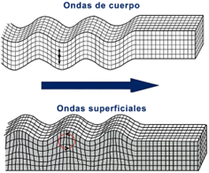 las ondas de cuerpo, que viajan a través de la Tierra y son parecidas a las ondas de sonido, y las ondas superficiales, las cuales viajan sólo por la superficie de la tierra y son análogas a las olas oceánicas. Las velocidades de las ondas son determinadas por la densidad y elasticidad de los materiales a través de los cuales viajan.