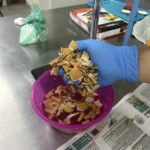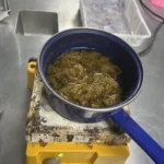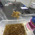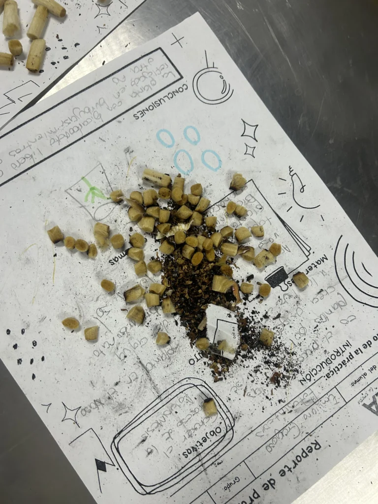 Para el proceso de purificación se cortaron y separaron para obtener pedazos pequeños. Este consistió en hervir las colillas en agua con vinagre y bicarbonato por cinco minutos, después solo en agua también por cinco minutos; enseguida se sumergen en alcohol por 24 horas dos veces, se dejan secando al sol para quitar el olor que pueda quedar. Imagen 1.