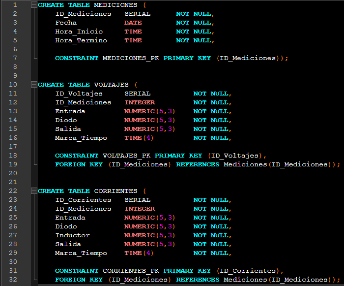Se implementó un sistema basado en un banco de convertidores de potencia que integra módulos de potencia (PWM), de procesos (Buck y Boost) y de adquisición de datos. Este último emplea sensores gestionados por un Arduino MEGA 2560 Pro Min y una ESP32 (Anexo 1), encargados del censado y la comunicación IoT. Los datos se envían a una base de datos PostgreSQL (Anexo 2), donde las variables de voltaje y corriente se organizan en tablas con una tasa de muestreo de 10 a 15 datos por segundo, información que sirve de insumo para la inteligencia artificial.