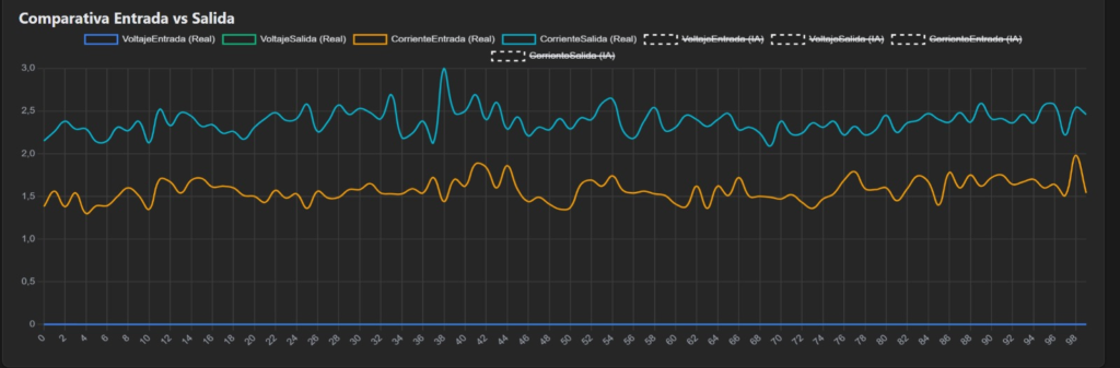 A partir de esta estructura, se desarrolló una plataforma web con interfaces para la visualización de datos mediante gráficas (Anexos 4, 5, 6, 7 y 8) y una función de historial con registro temporal (Anexo 6). Asimismo, se integró la predicción del comportamiento del convertidor (Anexos 4, 5 y 6) mediante una red neuronal. Esta arquitectura consta de 38 neuronas de entrada, dos capas ocultas de 512 neuronas para la abstracción de características y una capa de salida de 7 neuronas que estima los valores numéricos de las variables del sistema.