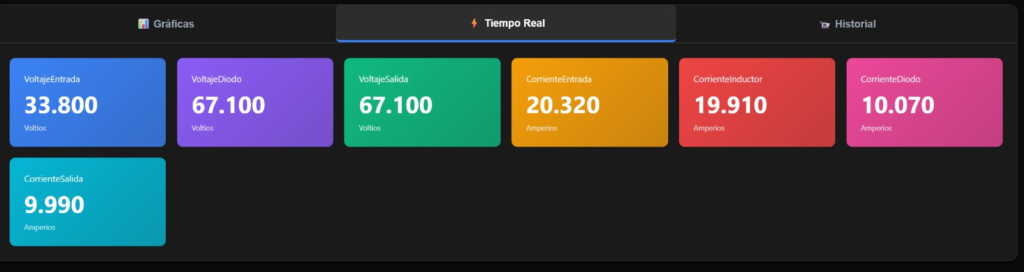Finalmente, se realizó una fase de validación física para asegurar la exactitud de los datos presentados. Mediante el uso de instrumentación especializada (multímetros), se midieron los valores reales de voltaje y corriente en las etapas de entrada y salida del convertidor CD-CD. Estos valores físicos se contrastaron con los datos visualizados en la plataforma digital; la mínima discrepancia entre la medición analógica y la digital permitió validar la calibración de los sensores y la confiabilidad del sistema de telemetría bajo condiciones de laboratorio reproducibles.