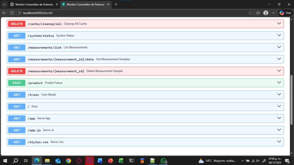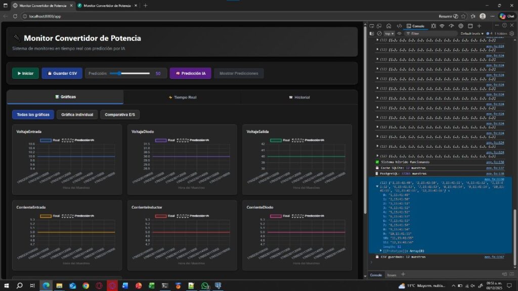 La metodología se dividió en cinco fases: diagnóstico de requerimientos, diseño de arquitectura de datos (utilizando PostgreSQL y FastAPI), integración de hardware mediante el microcontrolador ESP32, pruebas de software y validación experimental con instrumentación física. El sistema resultante utiliza una red neuronal con dos capas ocultas de 512 neuronas para predecir el comportamiento dinámico del convertidor con una tasa de muestreo de 10 a 15 datos por segundo.