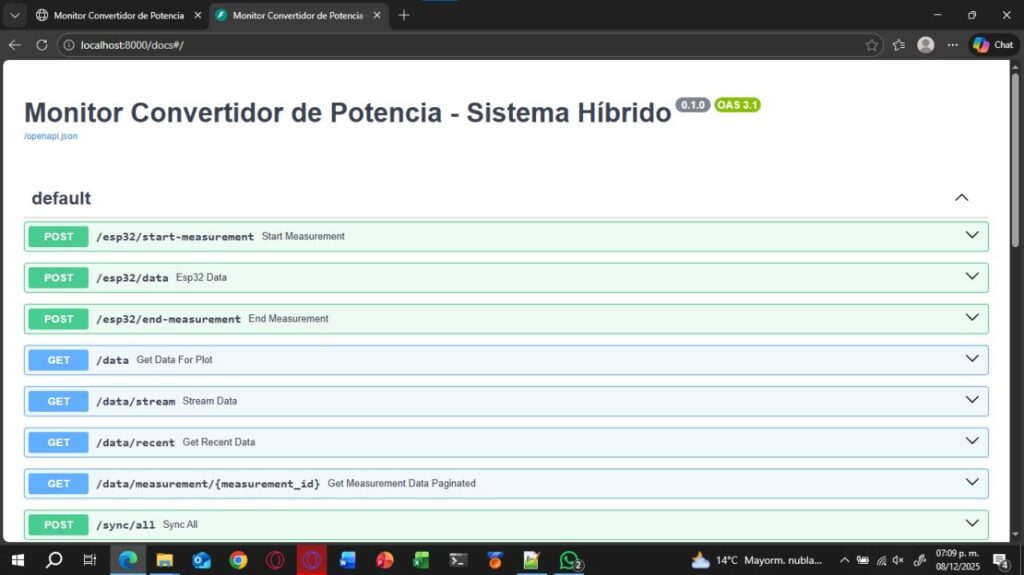 Esta fase se centró en establecer el puente de comunicación mediante el microcontrolador ESP32. Se implementó un protocolo que permite al sistema transmitir los datos de voltaje y corriente desde los sensores hacia el backend. Un aspecto crítico fue la configuración de la operación híbrida, asegurando que el sistema pueda gestionar la información tanto de forma local (offline) como a través de la red (online), garantizando la continuidad del monitoreo ante fallos de conectividad.