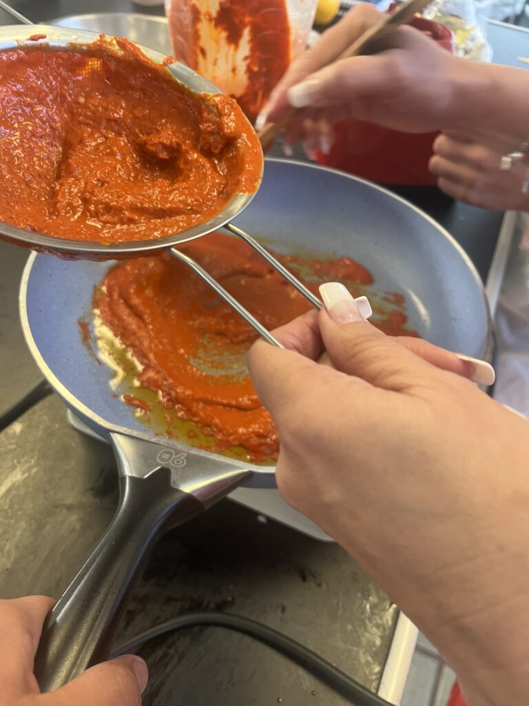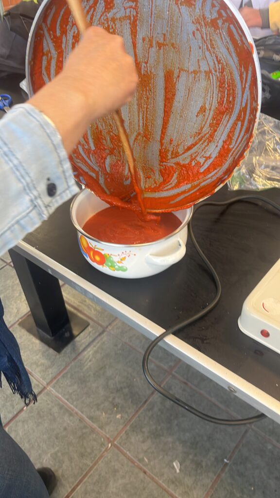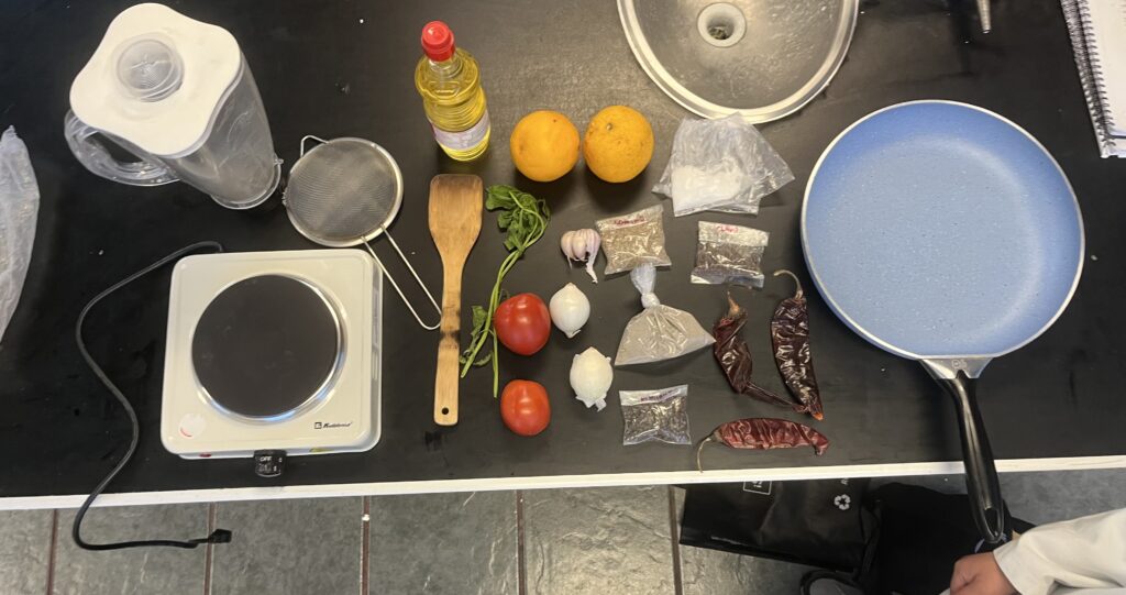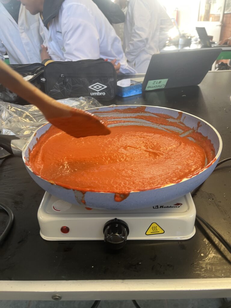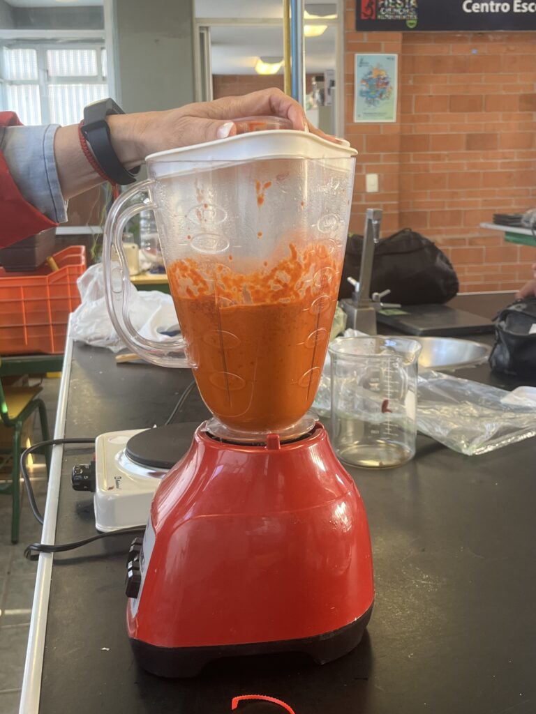 Concentrates are a practical, fast and accessible option for food production, as they allow processes to be streamlined without sacrificing flavour.In this project, guajillo chile was chosen as the main ingredient due to its wide use in Mexican cuisine, being an essential component in many traditional dishes.This chili is known for its mild, slightly sweet flavor and characteristic red color, making it ideal for adding depth and nuance to sauces, stews, and marinades.In addition to the guajillo chile, other fundamental ingredients and seasonings were incorporated to balance the flavors of the concentrate.Among them are salt, tomato, garlic and onion, which bring freshness and a touch of umami to the final product.The production process began with the mixture of these ingredients, which resulted in a reddish paste with a thin consistency.To achieve a practical and easy–to–use shape, pectin diluted in orange juice was used, which allowed the paste to be transformed into semi–solid spheres.These spheres, when in contact with boiling water, dissolve efficiently, releasing all the flavor of the concentrate into the liquid.In this way, the concentrate becomes a convenient option for those looking for an authentic and delicious flavor in a short time, without complicating long preparation processes.