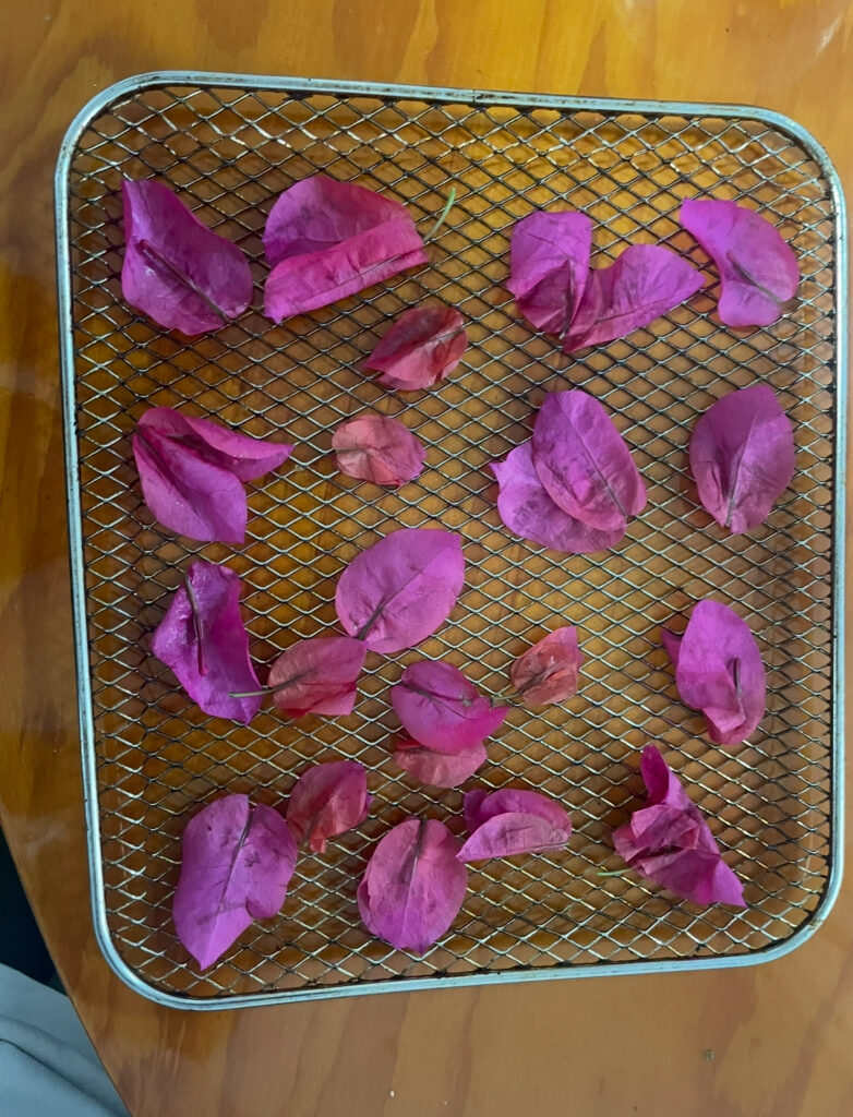 Comúnmente al utilizar bugambilia con agua se tiñe de un color morado o rosa esto se le atribuye al pigmento natural antocianinas pero es posible evitarlo. Posibles soluciones son agregar carbón activado o utilizar una menor cantidad de flores.