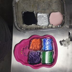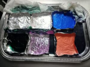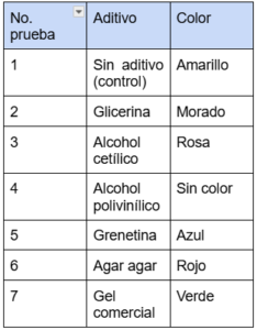 2.- Elaboración de muestras. Se prepararon 7 muestras utilizando diferentes aditivos y para su elaboración se tomaron 100 mL de la solución stock previamente preparada y mientras seguía caliente se le colocó 1g de uno de los siguientes aditivos: glicerina, alcohol cetílico, alcohol polivinílico, grenetina, agar agar, y gel comercial. Se dejó una muestra sin aditivos como muestra de control y a cada muestra se le agregó colorante vegetal para una fácil identificación. Cada muestra se colocó en charolas cuadradas de aluminio previamente engrasadas con aceite vegetal con dimensiones de 10 cm de largo por 10 cm de ancho y 2 cm de altura. La tabla 1 contiene la relación de las muestras con los colores elegidos para su identificación. Una vez vertidas las mezclas en los moldes se procedió a un periodo de secado al aire de 5 días hasta que las muestras quedarán firmes y pudieran ser desprendidas fácilmente.