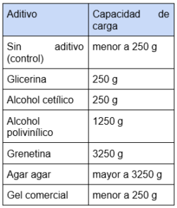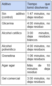 La tabla 2, 3 y 4 contienen los resultados de las pruebas de maleabilidad, resistencia física y solubilidad respectivamente. En las pruebas de maleabilidad la mayoría de las muestras puede doblarse, con la excepción de la elaborada con agar agar y las que se rasgaron al doblarse corresponden a la del alcohol cetílico y gel comercial. Al estirarlas la que presenta mayor elasticidad es la de glicerina. En las pruebas de resistencia física el resultado tiene un rango que va desde menos de 250 g (CMC y gel comercial) a mayor de 3250 g (agar agar) En el caso de las pruebas de solubilidad la mayoría a los 4 minutos se disolvió en agitación constante con la excepción de la muestra de agar agar que a los 10 minutos no se disolvió. La mayoría de las muestras no dejó residuos al momento de disolverse con la excepción del alcohol cetílico y el agar agar. En los anexos (figura 8) pueden consultarse las observaciones realizadas de las muestras con respecto a su textura y las descripciones realizadas.