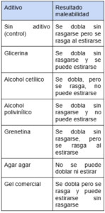 Tabla 1. Aditivos utilizados para la elaboración de bioplásticos