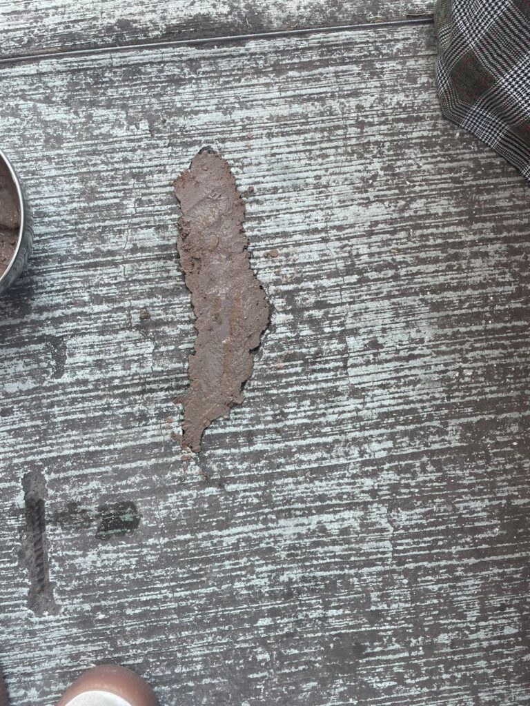 El tiempo de secado inicial fue de aproximadamente 30 a 50 minutos, mientras que el secado completo se alcanzó después de 24 horas en condiciones ambientales normales. Una vez seco, el material presentó una adecuada adherencia a la superficie del concreto, manteniéndose firme y sin desprendimientos visibles. Asimismo, se observó que la presencia de fibra de coco contribuyó a mejorar el secado interno de la mezcla, reduciendo la aparición de pequeñas fracturas durante el proceso de secado.