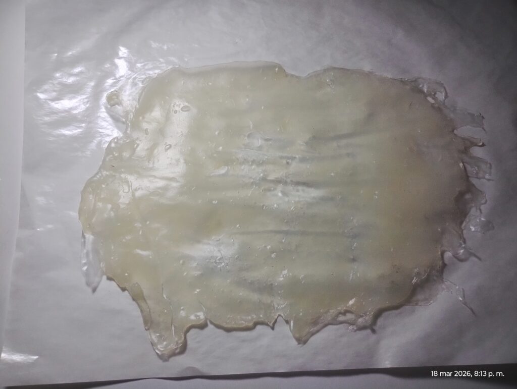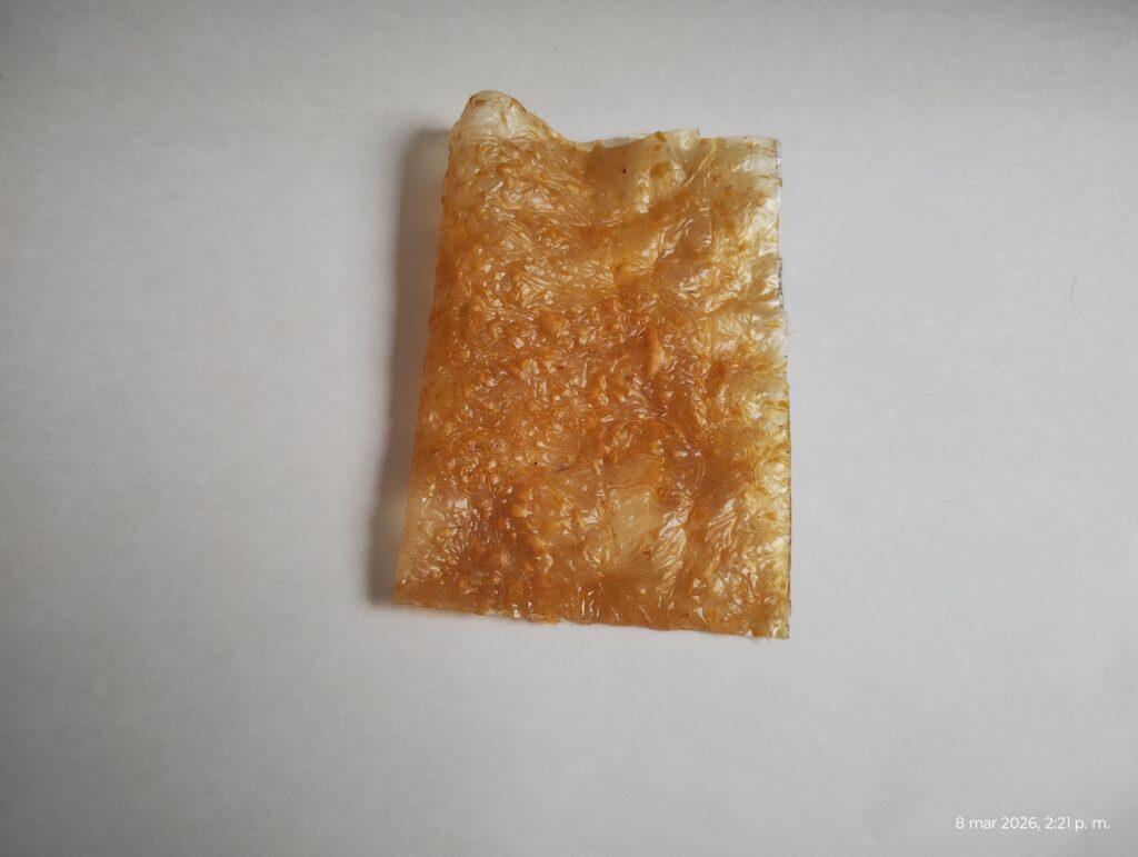 En la primera prueba se obtuvo una bolsa rígida que presentaba varios grumos, con un color amarillo muy opaco y algunas zonas tonos café oscuro. En la segunda prueba, la bolsa mostró una menor cantidad de grumos, no obstante, se encontraba cuarteada y presentaba un color anaranjado menos opaco que en la primera. En la tercera se logró obtener una bolsa sin grumos aunque muy rígida, en esta ocasión, no se encontraba fragmentada, sin embargo era bastante frágil y poco elástica, esta contaba con un color amarillo transparentoso claro. En las últimas pruebas se obtuvieron unas bolsas más uniformes en cuanto apariencia y resistencia, se observó que se consiguieron las bolsas más elásticas, en está ocasión carecían de grumos y grietas, también se observó la presencia de pedazos peueños de la cáscara de mango, el peso de la bolsa fue de 25g.