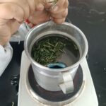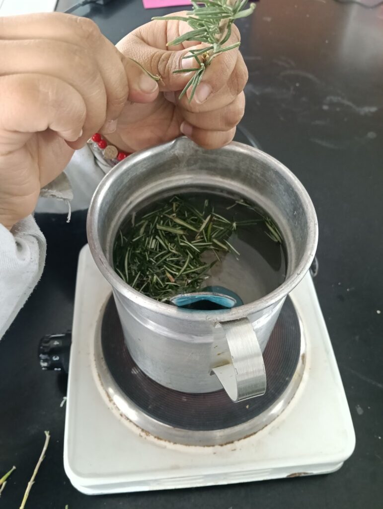 En una olla se agrega 10 litros de agua y se añade el kilogramo de las hojas, dejar hervir durante 60 minutos a fuego lento, una vez que se hirvió por 60 minutos se tapa la olla y se deja reposar por 12 horas, pasando las 12 horas de reposo se cuela y se pone en el recipiente.