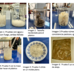 Para desarrollar nuestro plástico biodegradable, se hicieron 5 pruebas, la primera fue con agua, celulosa de madera y telaraña, los ingredientes no se mezclaron y obtuvimos una consistencia pastosa y se hicieron grumos.
