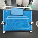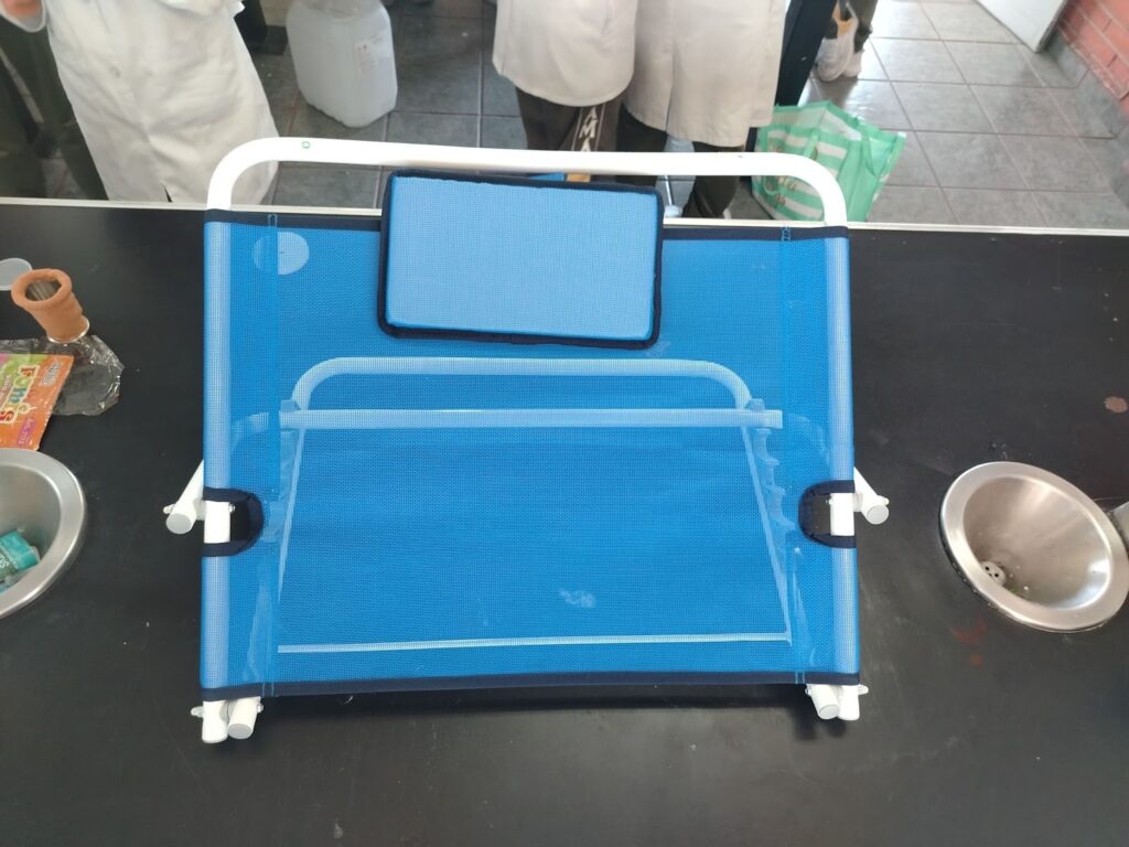 6. Se utilizan tubos para crear la base de la almohada. Los tubos se colocan en posición horizontal y se agrega una base que permite cambiar la posición. Posteriormente, todo se atornilla y se complementa la base con una malla para brindar mayor apoyo.
