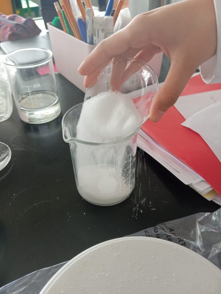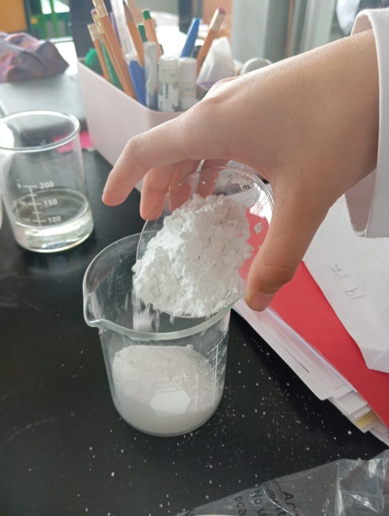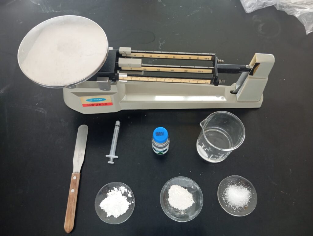 1.-En un recipiente mezclar los 10 gr de arcilla blanca, los 20 gr de xilitol y los 20 gr de carbonato de calcio.