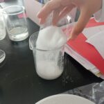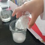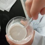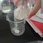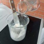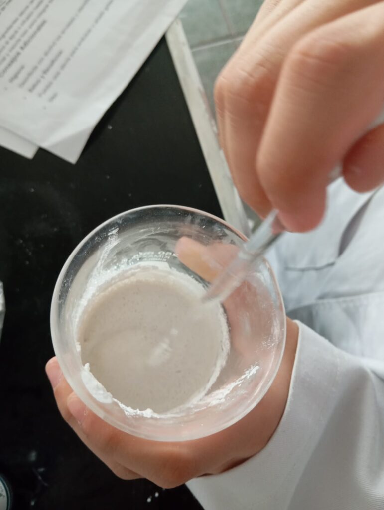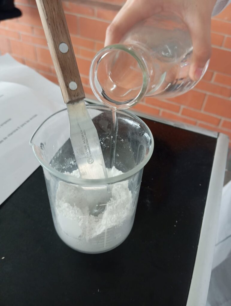 2.-Agregar poco a poco el agua potable hasta que la mezcla tenga la consistencia deseada, es decir como una pasta, mientras se revuelven con la varilla de vidrio.