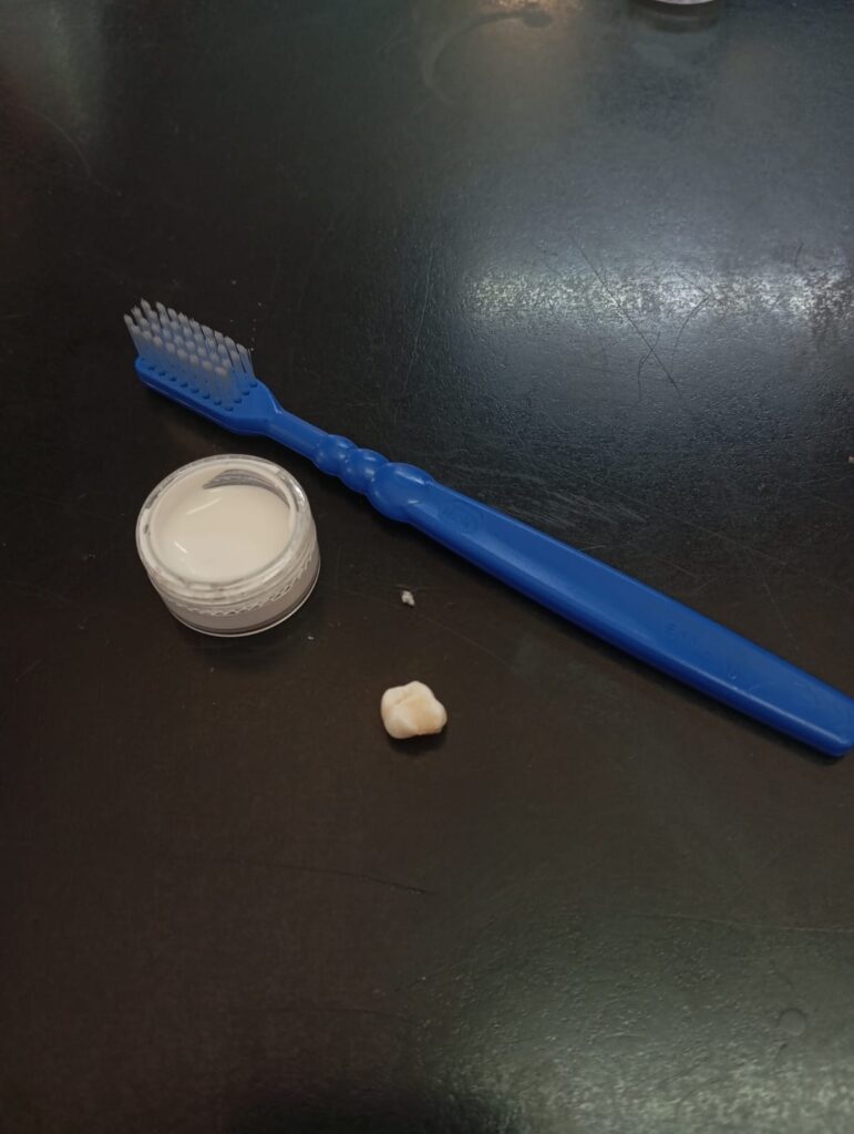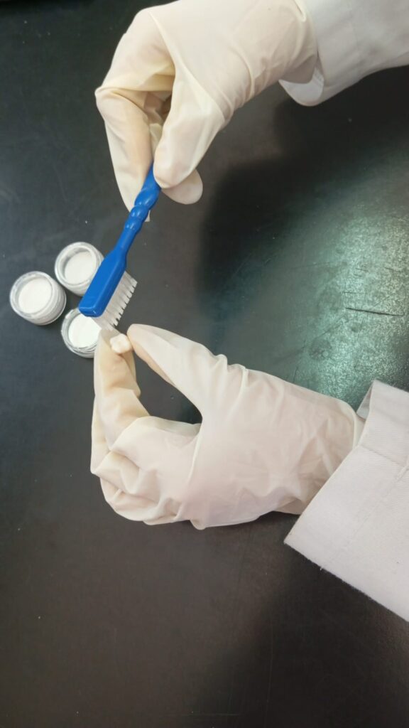 Se realizaron dos pruebas con el objetivo de ofrecer una alternativa para las personas con déficit en el funcionamiento de la tiroides y observar los efectos de nuestro producto sobre una superficie con características similares al esmalte dental. En la primera prueba se utilizó un cascarón de huevo, ya que su composición simula  el comportamiento del esmalte dental. Sobre el cascarón se aplicó la pasta y se procedió a cepillar aproximadamente 30 segundos. Se logró comprobar que el cascarón mantuvo su color original, no presentó manchas, alteraciones visibles ni cambios en su superficie al estar en contacto con nuestra pasta.La segunda prueba fue realizada con una pieza dental. El diente fue cepillado durante cuatro días, siguiendo el mismo método que la primera prueba. No se observaron cambios visibles en el esmalte, como desgaste, manchas, o alteraciones en la textura. Estos resultados indican que nuestra pasta no provocó daños en la estructura dental.El producto puede utilizarse sin generar alteraciones visibles inmediatas en el esmalte.