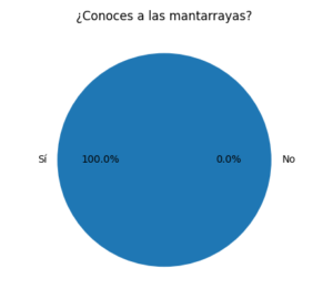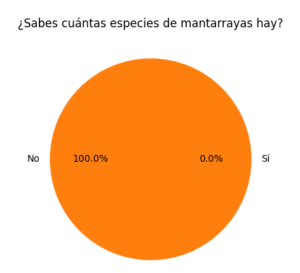 Los resultados de las encuestas muestran que el 100% de las personas encuestadas conoce a las mantarrayas, lo que indica que es una especie reconocida por el público. Sin embargo, el 100% desconoce cuántas especies existen, lo que demuestra que el conocimiento es general y no profundo.