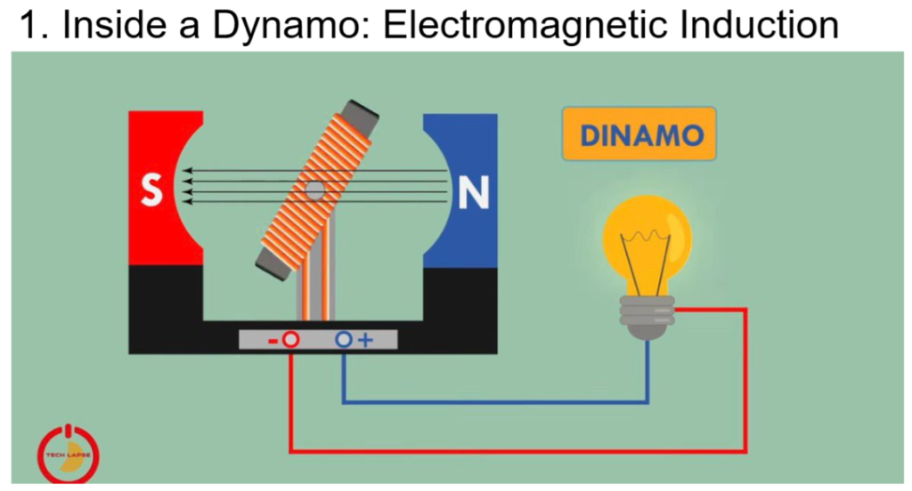 Esto pasa porque dentro del dinamo hay un imán y cables, y cuando el imán se mueve, se genera electricidad. Esto se llama inducción electromagnética (como aprendimos en la teoría) .