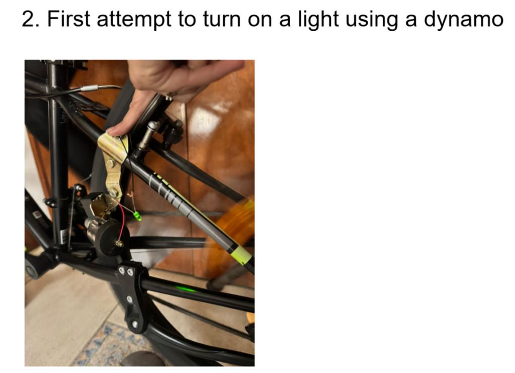 In this project we learned how to generate electricity using a bicycle with a dynamo. We wanted to test if the motion of a wheel can turn on lights without using batteries.