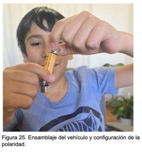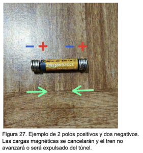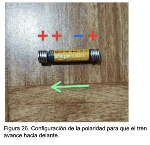 • Al configurar el tren con tres polos positivos y uno negativo, el sistema avanzó invariablemente hacia el lado positivo de la pila.