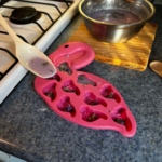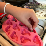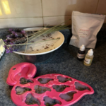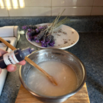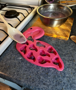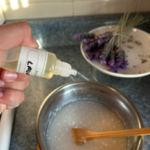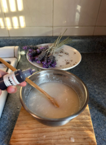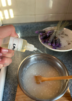 4-Dejar enfriar 2 minutos y agregar el aroma ; 5 gotas de colorante de lavanda.