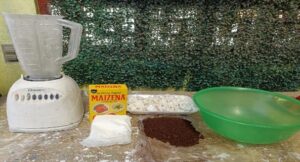 Cuando ambos ingredientes principales se encuentren completamente secos, se procede a la preparación de la mezcla. Para facilitar la manipulación del material y favorecer su endurecimiento, se utilizará fécula de maíz y agua como aglutinantes naturales.