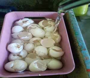 De manera paralela, se recolectan las cáscaras de huevo de gallina, las cuales deben lavarse cuidadosamente para eliminar cualquier residuo. Una vez limpias, se trituran y se exponen al sol durante varios días hasta que estén totalmente secas, con el objetivo de prevenir la aparición de hongos.