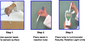 Los pasos de un ensayo de bioluminiscencia de Adenosina Trifosfato (ATP), molécula energética presente en todas las células vivas. la cual sirve para monitorear la limpieza de una superficie, en este caso son: