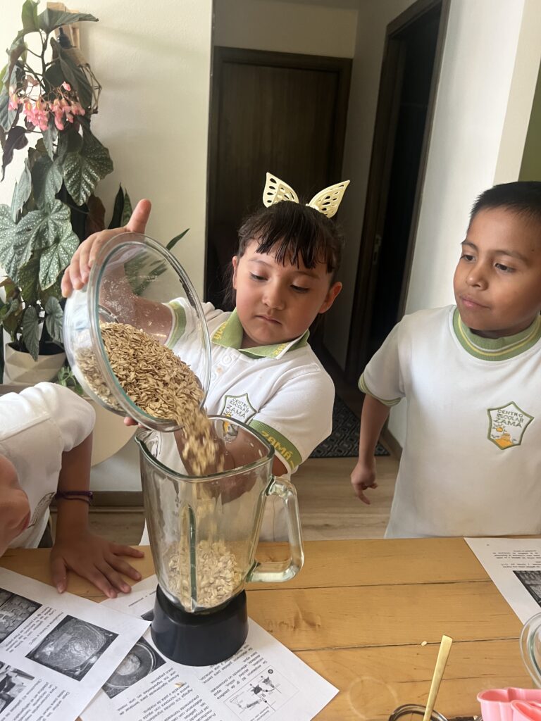 En una licuadora o procesador triturar la avena, a la textura de preferencia (sin buscar un resultado fino, permite a las personas identificar de qué ingrediente está elaborada)